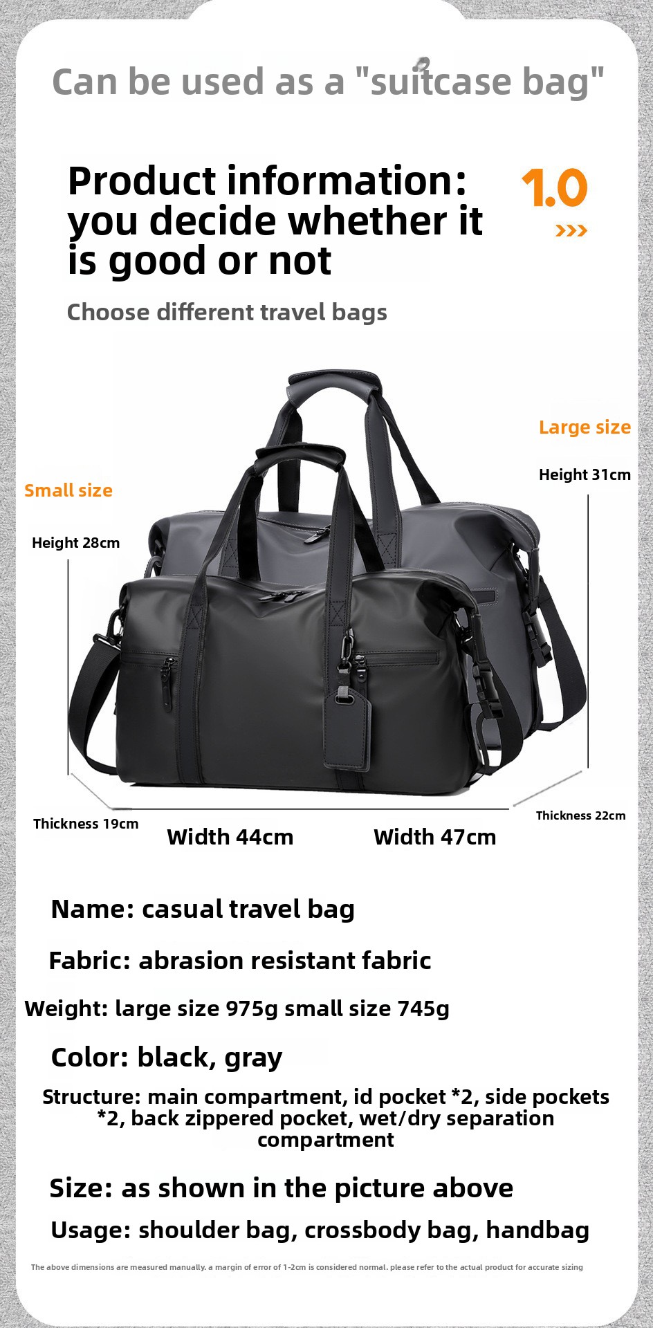 Dry-Wet Separation: Convenient compartments for separating wet and dry items during travel.