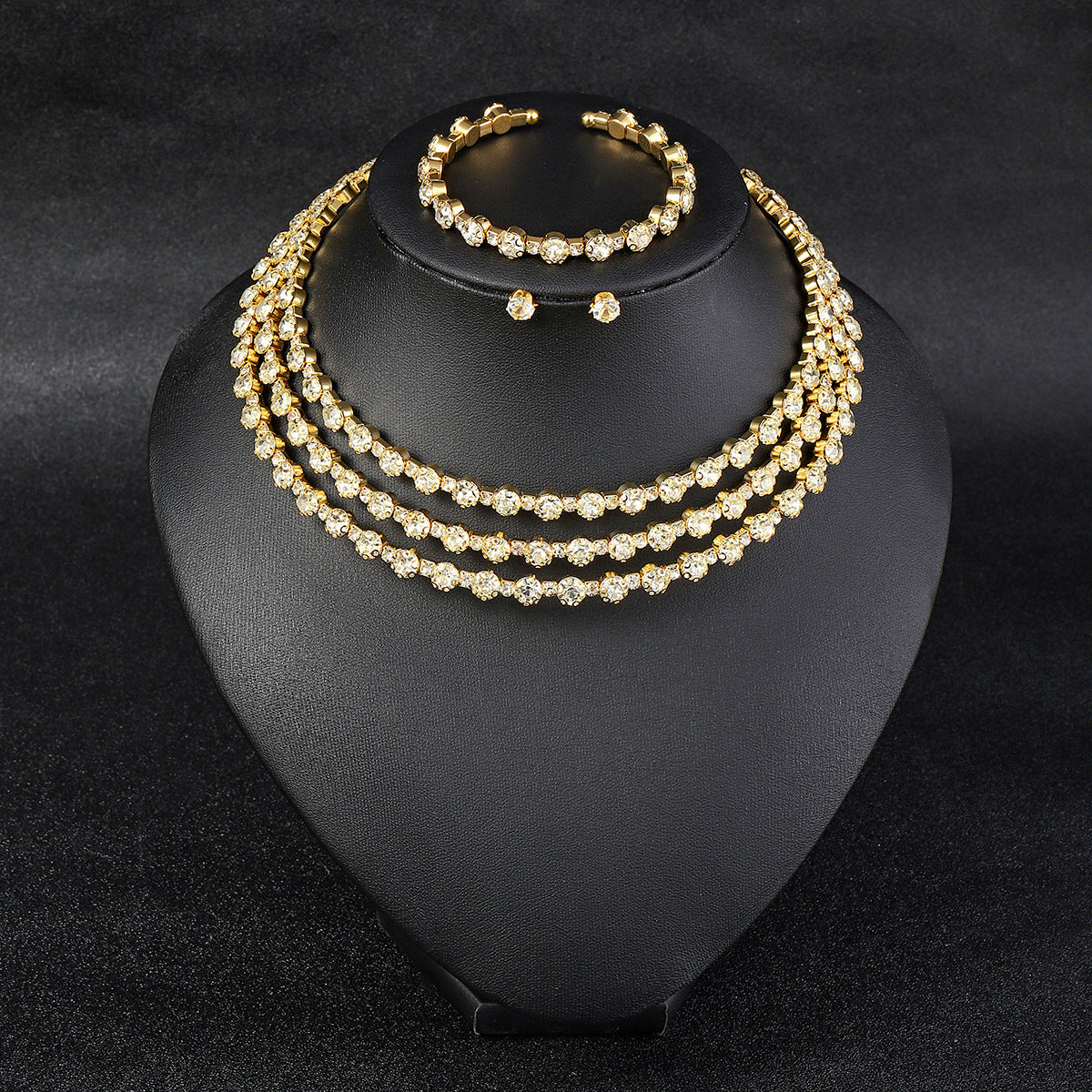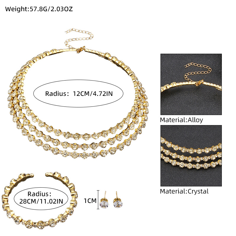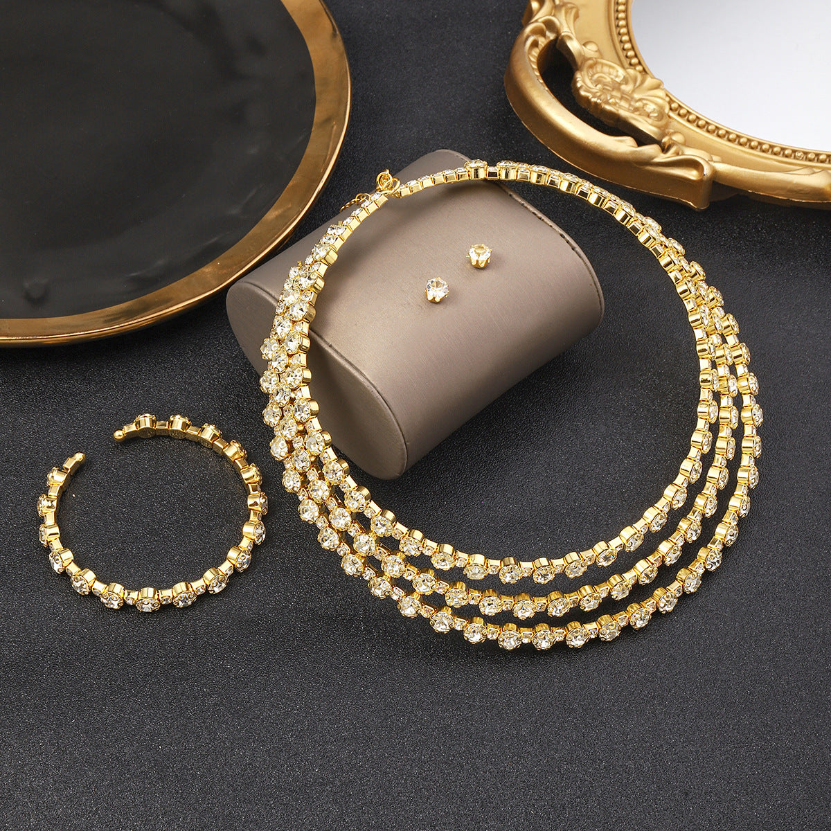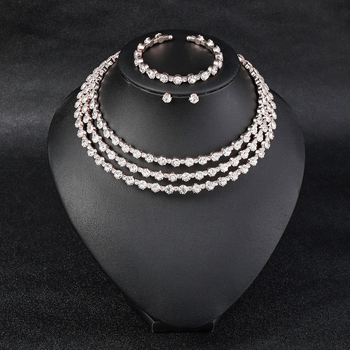 Elegant Design: Three-row diamond collar, bracelet, and earrings set for a complete bridal look.