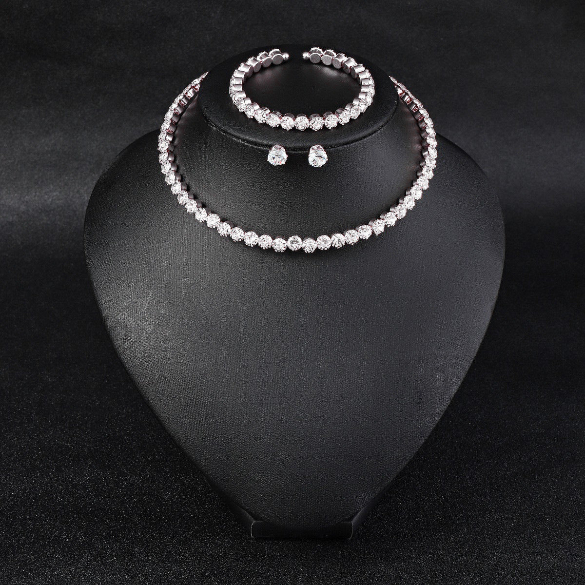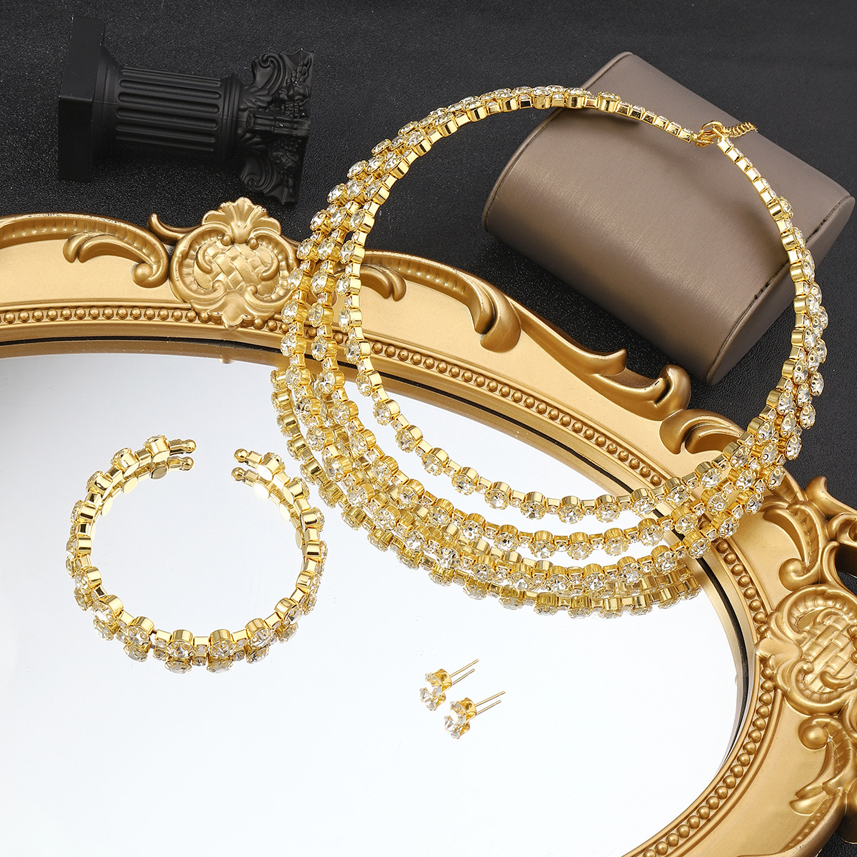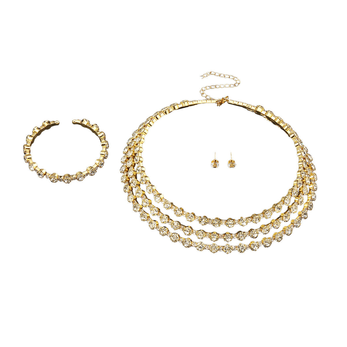 Elegant Design: Three-row diamond collar, bracelet, and earrings set for a complete bridal look.