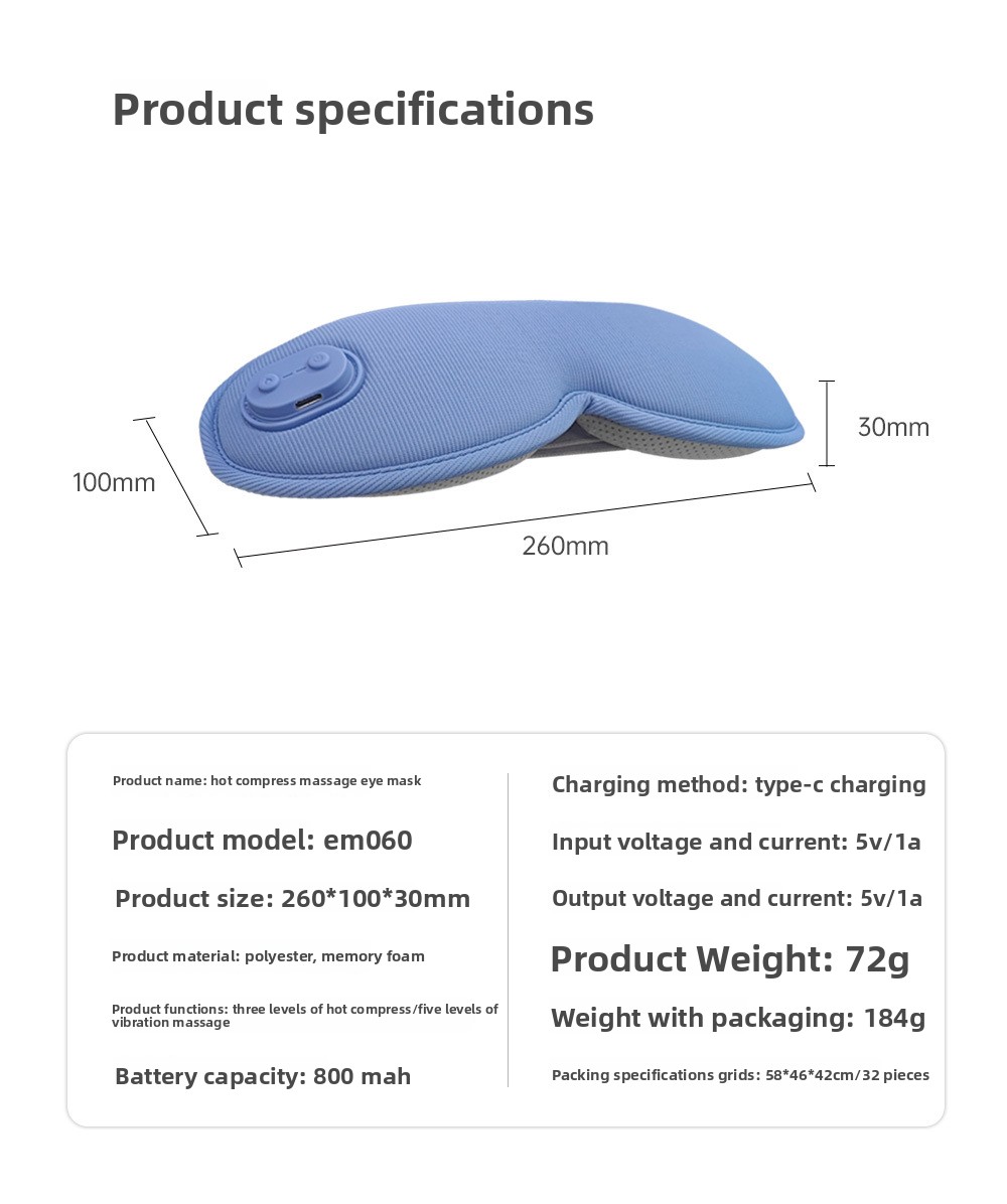 Functions: Heat compress, eye massage, eye protection, sleep aid, fatigue relief, light blocking, intelligent temperature control