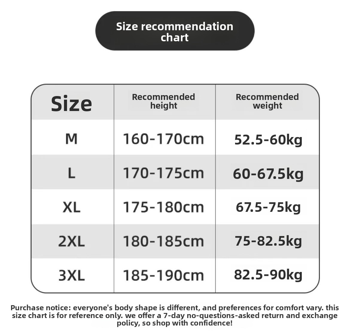 Sizes: M, L, XL, 2XL, 3XL.