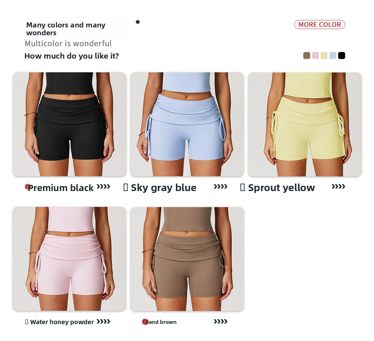 Colors: Premium black, Sky gray blue, Young bud yellow, Water honey powder, Sand brown